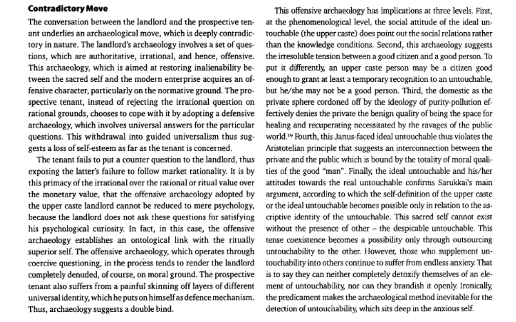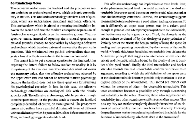 Guru concludes by babbling about 'the irresoluble tension between the good citizen and the good person.' This entails detecting untouchability through 'arcaheological methods'- i.e. digging up long buried stuff- deep in the 'anxious self'. In other words, these idiots are setting themselves up as Metaphysical Surgeons who will dig up and excise a present and manifest Social Evil, except not yet, never yet. Why not? If they did, they would be discovered to be charlatans. Still, for the moment, they can publish their worthless articles in worthless Journals that they themselves now edit.